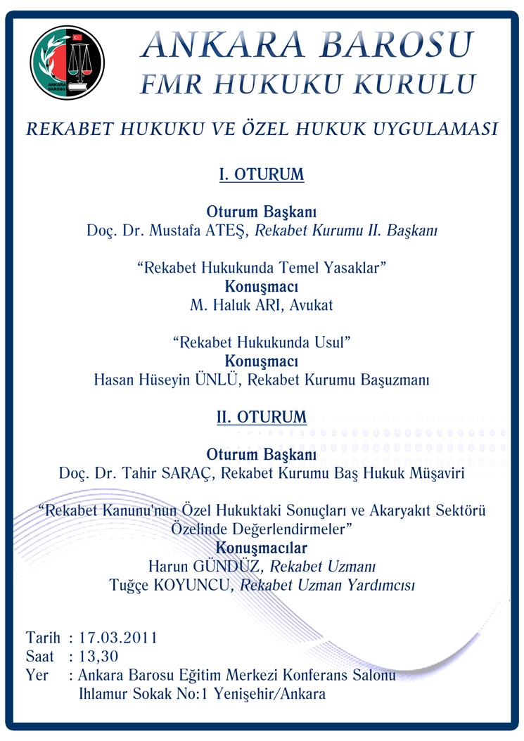 Ankara Barosu FMR Hukuku Kurulu tarafından düzenlenen “Rekabet Hukuku ve Özel Hukuk Uygulaması” konulu toplantı 17 Mart 2011 Perşembe günü gerçekleştirilmiştir.