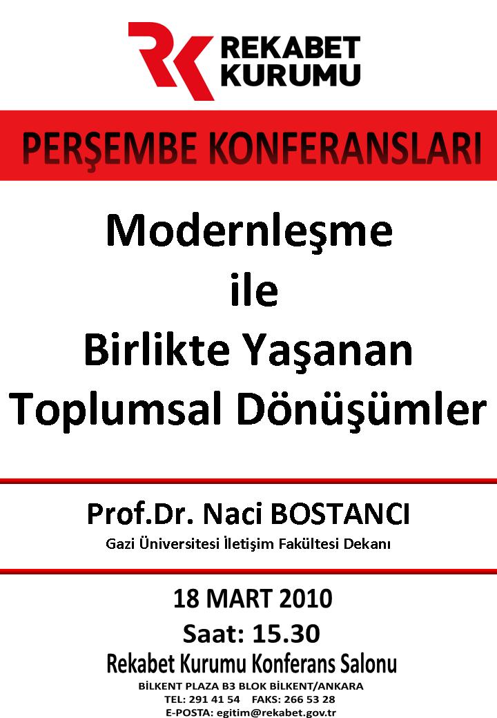 Kurumumuzda 10. yılını dolduran geleneksel "Perşembe Konferansları" kapsamında 18 Mart 2010 Perşembe günü düzenlenen “Modernleşme ile Birlikte Yaşanan Toplumsal Dönüşümler” konulu konferansa Gazi Üniversitesi İletişim Fakültesi Dekanı Prof.Dr. Naci BOSTANCI konuşmacı olarak katıldı.