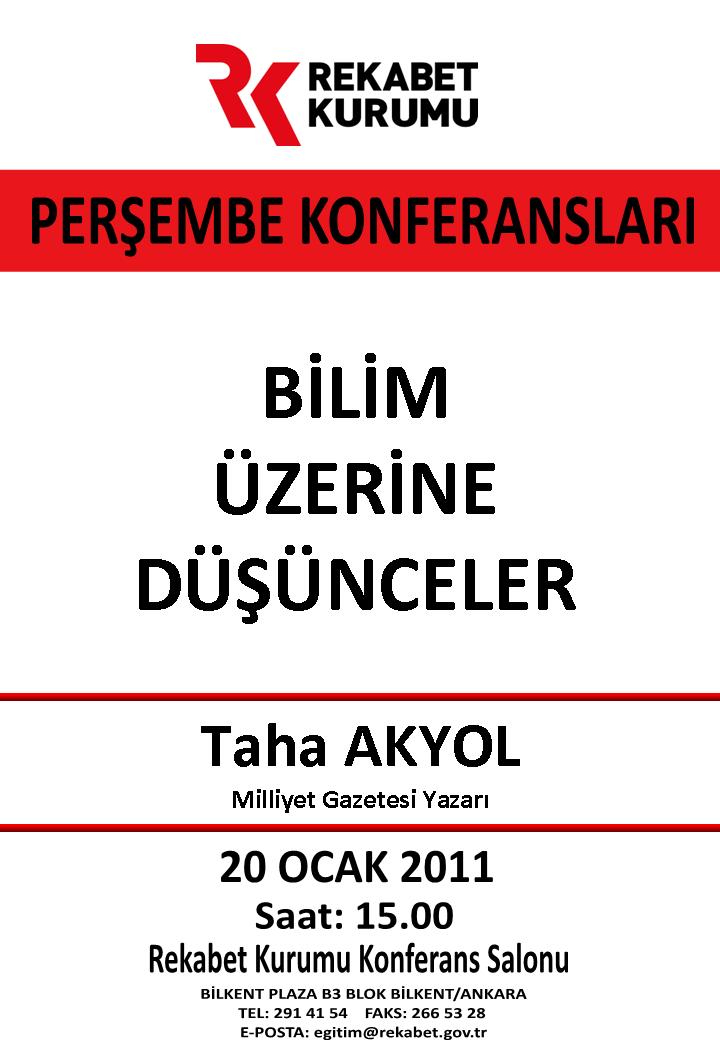 Kurumumuz tarafından düzenlenmekte olan Perşembe Konferansları çerçevesinde 20 Ocak 2011 tarihinde Milliyet Gazetesi Yazarı Taha AKYOL,“Bilim Üzerine Düşünceler” konulu konferansa konuşmacı olarak katılmıştır.