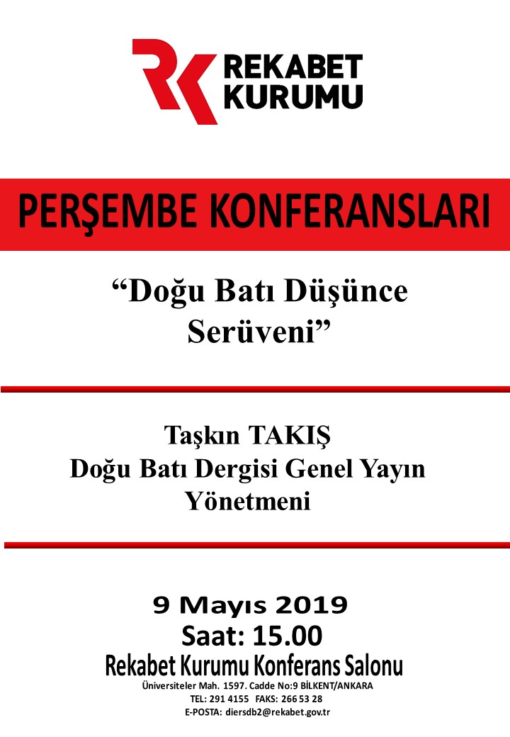 9 Mayıs 2019 tarihinde saat 15.00’de Rekabet Kurumu Konferans salonunda düzenlenecek olan perşembe konferansında, Doğu Batı Dergisi Genel Yayın Yönetmeni Taşkın TAKIŞ “Doğu Batı Düşünce Serüveni” konulu bir sunum gerçekleştirecektir.
