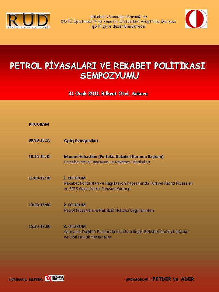 Rekabet Uzmanları Derneği ve ODTÜ İşletmecilik ve Yönetim Sistemleri Araştırma Merkezi işbirliğiyle ülkemiz petrol piyasalarının rekabet politikası ve düzenleme perspektifinden değerlendirildiği “Petrol Piyasaları ve Rekabet Politikaları” konulu bir sempozyum düzenlenmiştir.